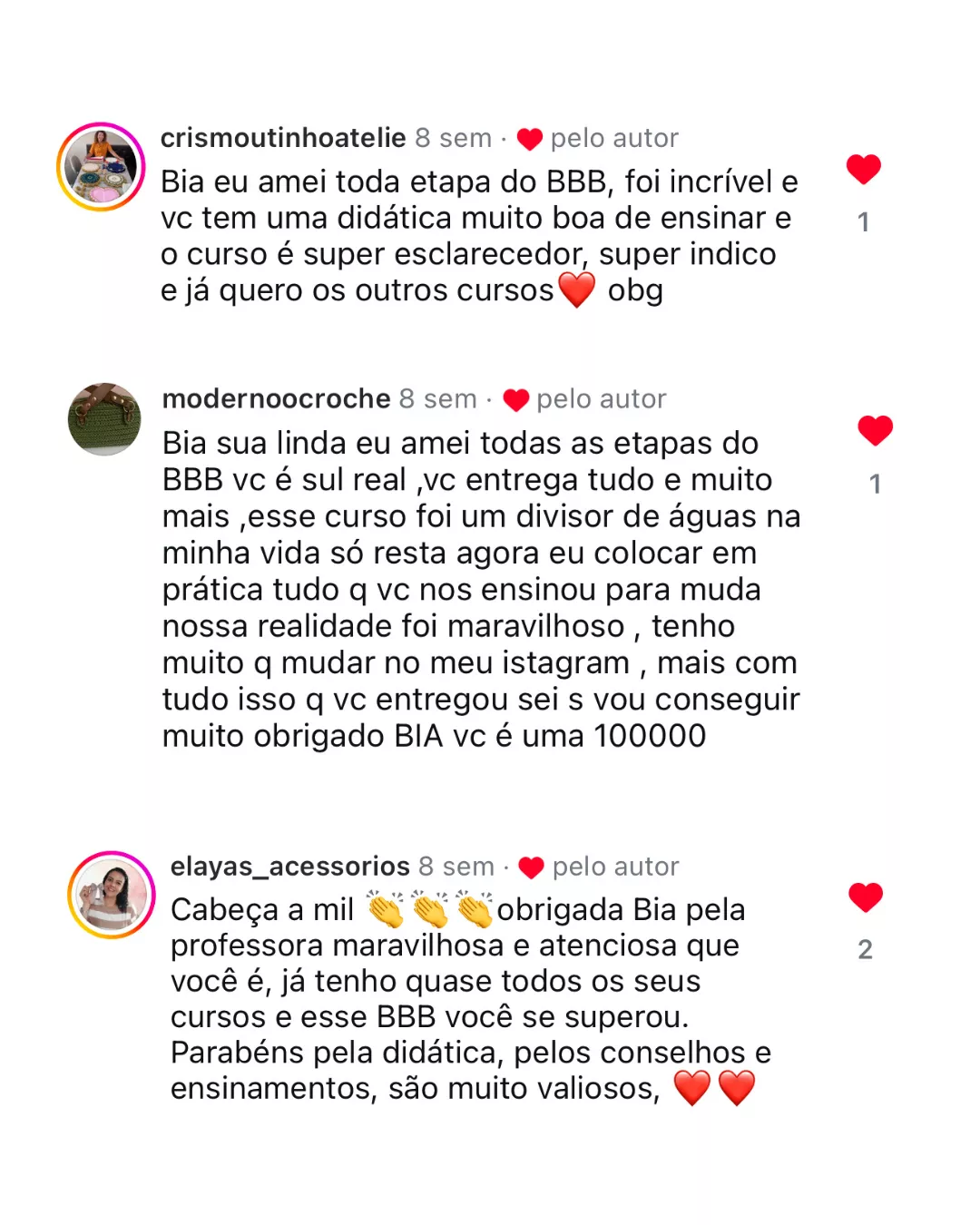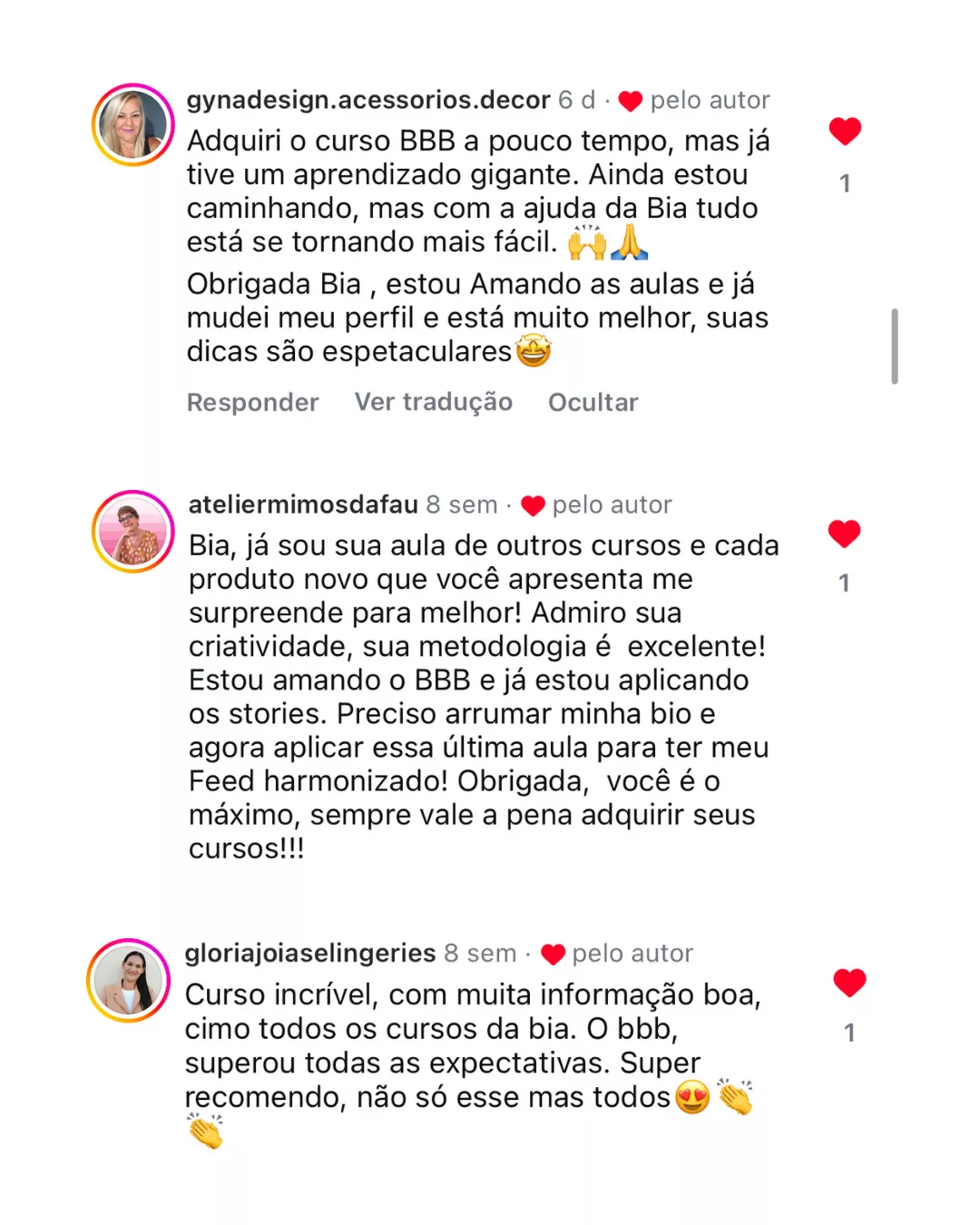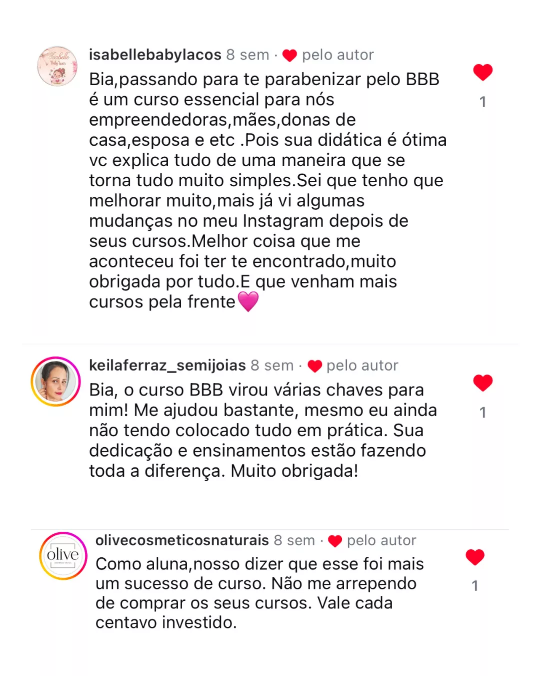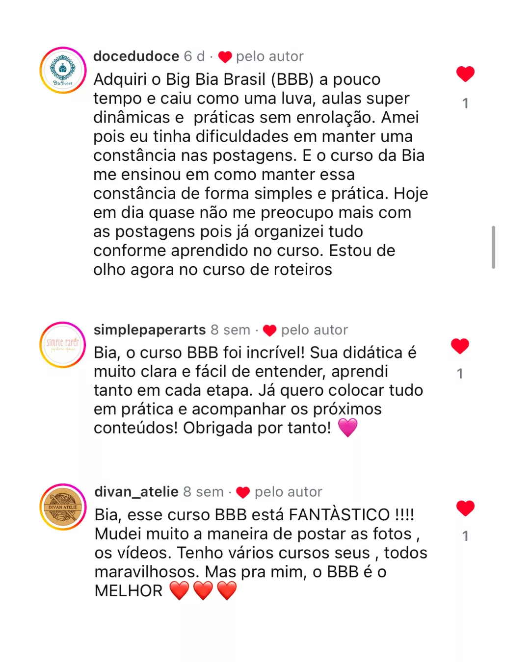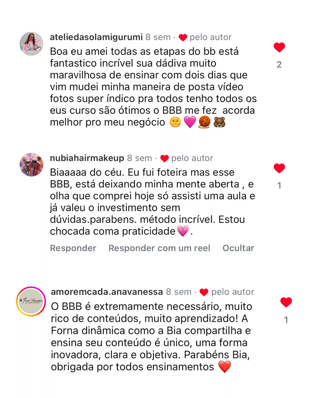 O Big Bia Brasil é um programa completo, inspirado na dinâmica do reality mais famoso do país, criado para ajudar empreendedoras a dominar o Instagram, atrair mais clientes e aumentar suas vendas. Você vai aprender, passo a passo, como transformar seu perfil em uma verdadeira vitrine de sucesso.